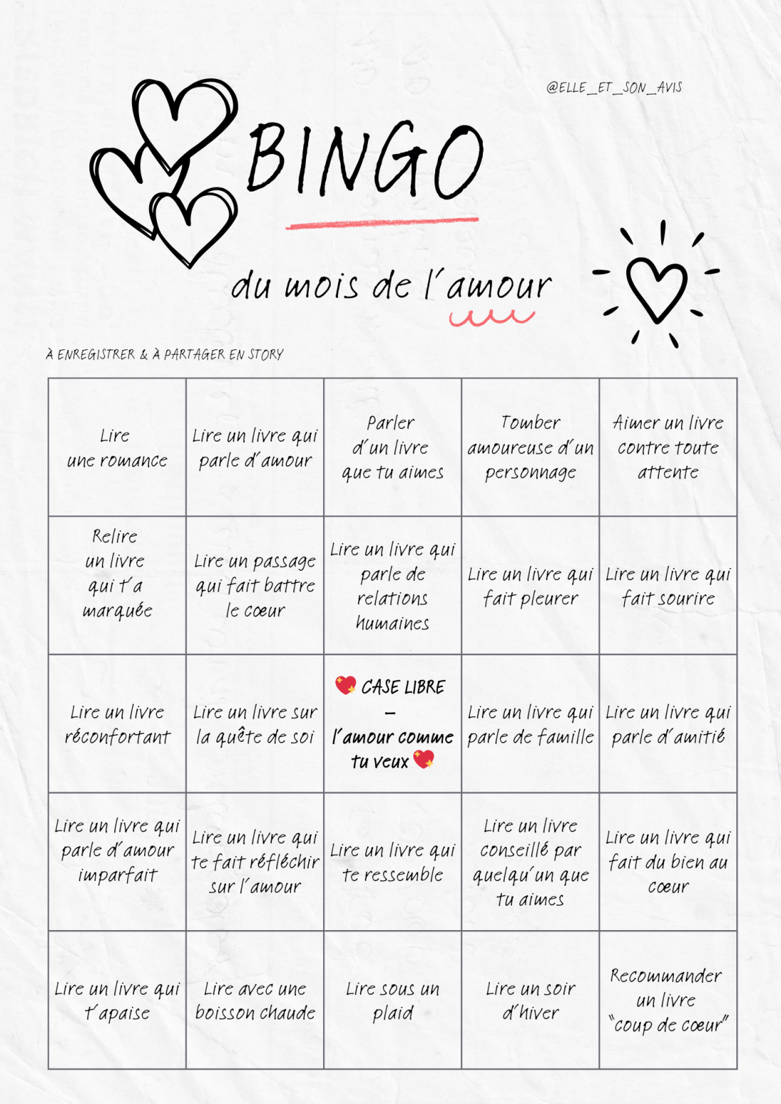 Février est souvent présenté comme le mois de l’amour. Mais si, cette année, on décidait de le vivre autrement ? Pas seulement à travers les grandes romances idéalisées, mais à travers l’amour sous toutes ses formes : celui qui réconforte, qui questionne, qui fait grandir, qui apaise… et surtout, celui que l’on ressent en lisant. … Lire la suite Bingo lecture : lire avec le cœur pendant le mois de l’amour 💗