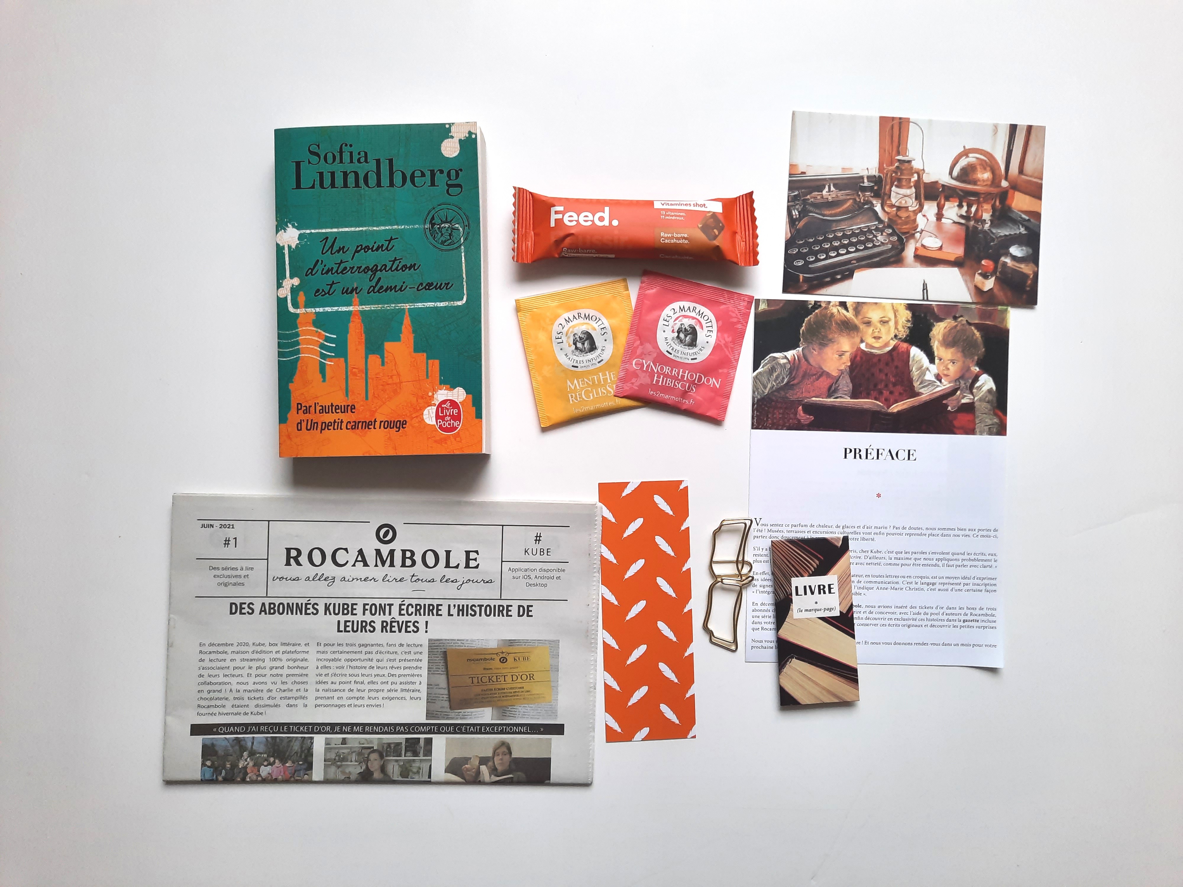 Pleins de choses à découvrir j’adore. Une carte postale pour envoyer au libraire qui a choisi notre lecture lui dire notre ressenti, du thé à découvrir, un marque page original, un marque page avec des plumes, une barre céréales, un journal et le livre du mois qui a été sélectionné pour moi en fonction de mes gouts ! J’avais mis mes goûts de lectures pour que le libraire partenaire de la Kube me propose un livre. Une histoire que j’ai hâte de découvrir.