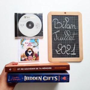 Au niveau de mes lectures je n’ai pas lu grand chose car il est vrai qu’en étant en vacances avec mon fils on a plutôt profité de faire plein d’activités ensemble. Je vous ai quand même présenté deux romans et un livre audio. Les deux romans étaient « Et me souvenir de ta mémoire » de Cécile Bergerac et « All our hidden gifts, tome 1″ de Caroline O’Donoghue. Et en livre audio « La part du lion » de Pierre Diaz